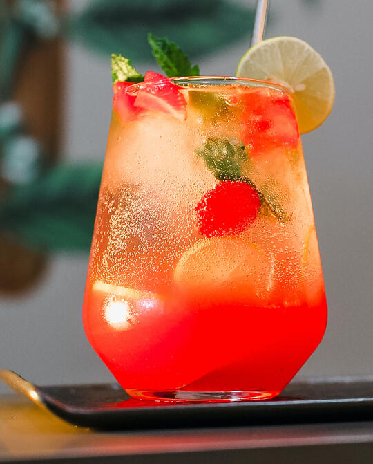 This bubbly beverage is inspired by the feeling of butterflies you get when you see the gentle flush of your lover's cheeks as they gaze at you after a long, slow kiss. We combine sparkling wine, house gin, fresh rolanberry and heavens lemon juices, and a touch of simple syrup to bring you a drink sure to get you ready for more of that sweet time with your beloved.